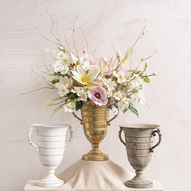 This vase is is water resistant, but not waterproof. We recommend using a liner when using with wet products. This vase is sold individually and measures 30.5cm at its widest point, 24cm at its narrowest point, and 35.5cm tall.
