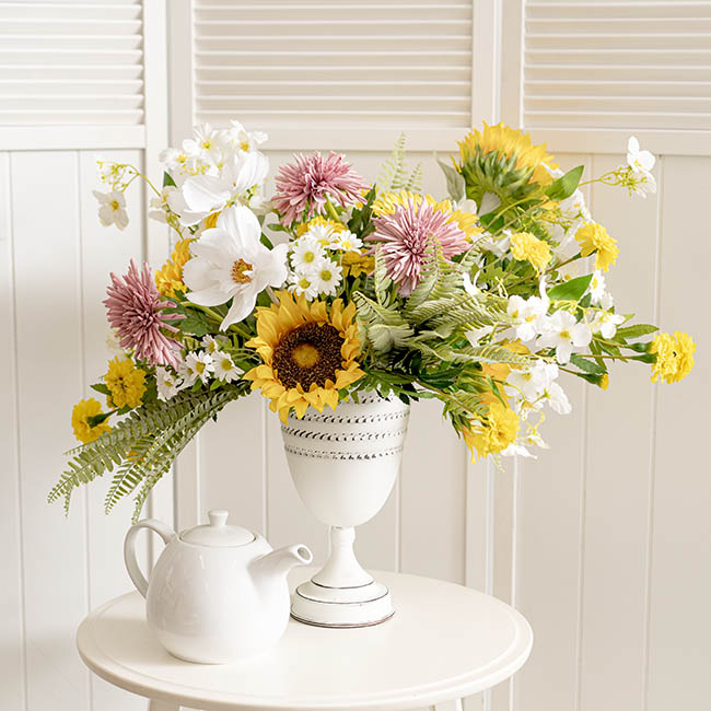 This vase is is water resistant, but not waterproof. We recommend using a liner when using with wet products. This vase is sold individually and measures 16cm at its widest point and 27.5cm tall.
