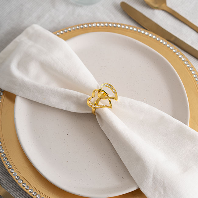 Our Diamante Heart Napkin Ring in Gold is a statement napkin ring designed to stand out. With a design of two interlinked (and bejewelled) hearts, this is a romantic napkin ring perfect for weddings, engagement parties, anniversary parties, Valentine's Day, and romantic dinners. Pair this napkin ring with our gold diamante charger plate 1101008GO for a complementary aesthetic.