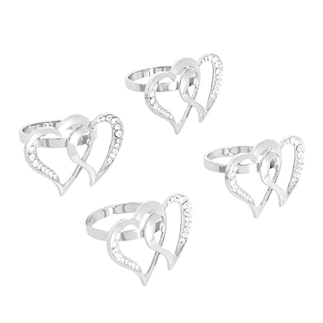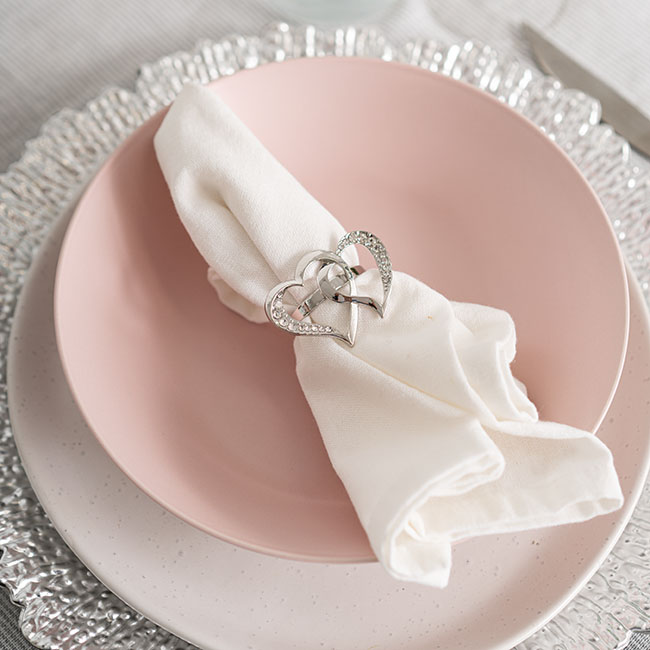 Our Diamante Heart Napkin Ring in Silver is a statement napkin ring designed to stand out. With a design of two interlinked (and bejewelled) hearts, this is a romantic napkin ring perfect for weddings, engagement parties, anniversary parties, Valentine's Day, and romantic dinners.