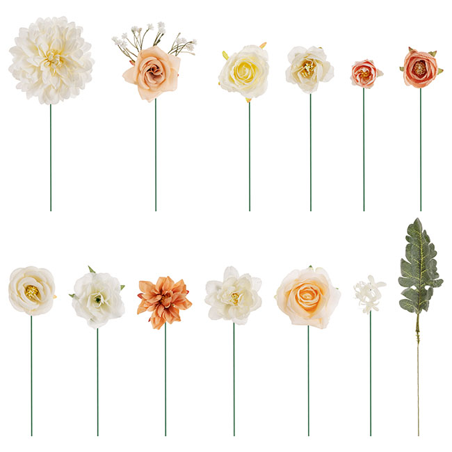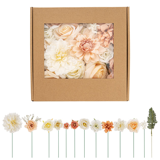 Let your creativity run free with DIY Mixed Flower Arrangement Box. A curated selection of complementary cream and beige flowers with wire stems, this box is ideal for a range of DIY projects, such as vase arrangements, putting finishing touches on a wreath, an event backdrop or balloon garland, flower crowns, bouquets, cake flowers, gift packaging, and more.