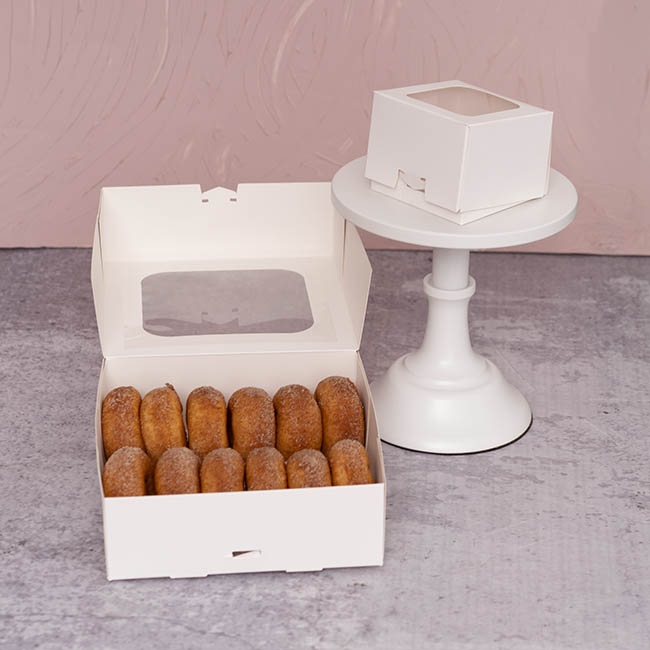 This window donut/cookie box is perfect for displaying your decorated donuts or loaded cookies. Designed for four donuts or cookies, this food grade white box with window is 20cm wide, 20cm deep and 7cm high.