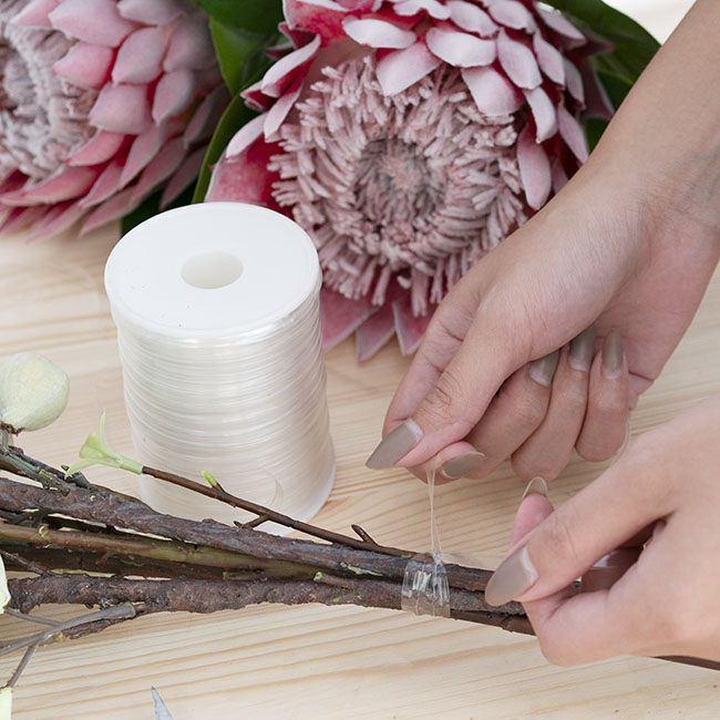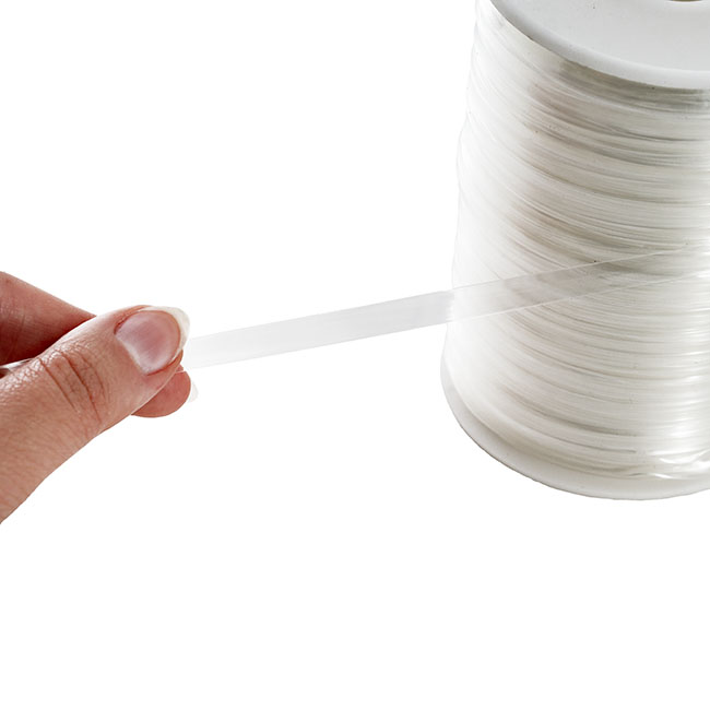 Clear elastic bouquet tie tape is very similar to parafilm in function and use. This material is like elastic bra straps or dance elastic. It is mostly used to wrap around bouquets and corsages to hold them tight. Being clear and stretchy, it is almost invisible and very neat.