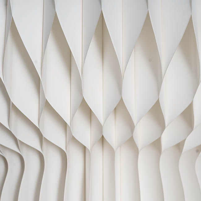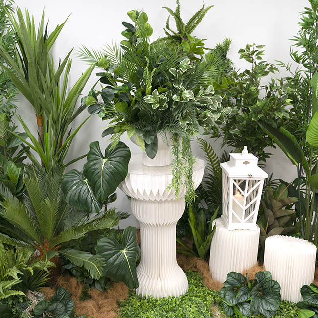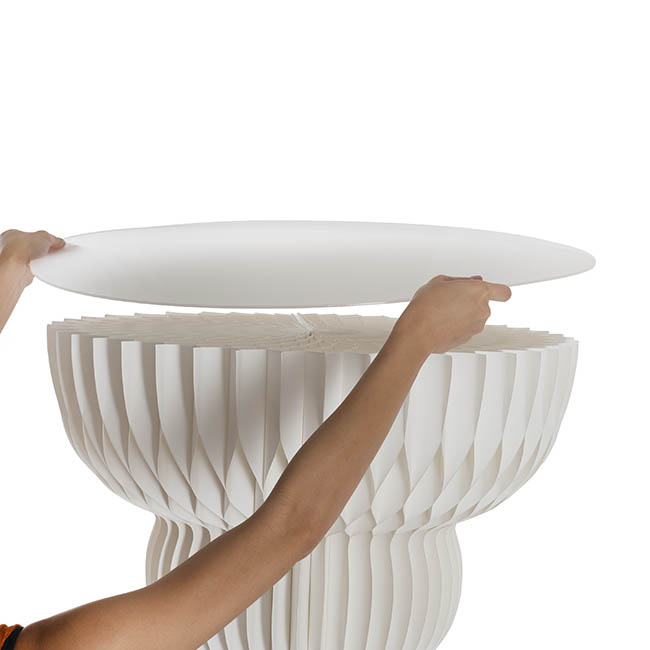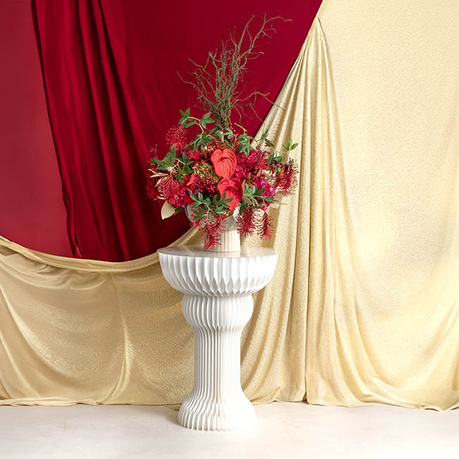 The Elegant Foldable plinth has a unique 90 layer accordion construction with an elegant ripple honeycomb look. This plinth measures up to 65cm in diameter 90cm tall.