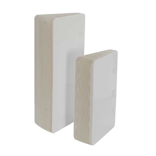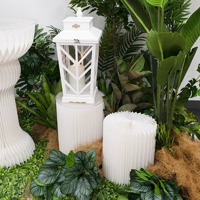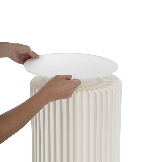 The Elite Foldable pedestal has a unique 90 layer accordion construction with an elegant ripple honeycomb look. Each column is 31cm in diameter and comes in two sizes: 35cm and 45cm tall. Each column has a frosted finish acrylic topper, measuring 31cm in diameter and 3mm thick. The acrylic top provides a smooth, level surface for displays and fortifies the stand to bear a weight of up to 60kg.