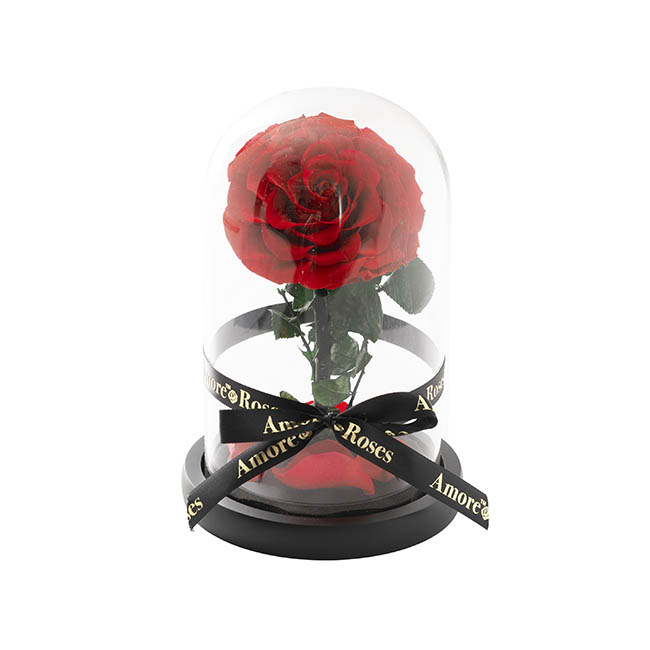 The rose head measures between 8.5 to 9cm in diameter and the cloche measures 12cm in diameter and 20cm tall. The glass dome is not fixed onto the wooden base, so the rose can be displayed with or without the glass dome.