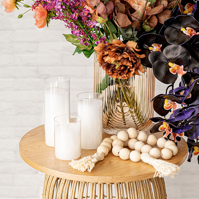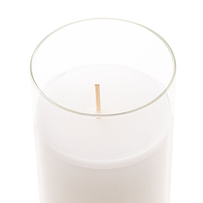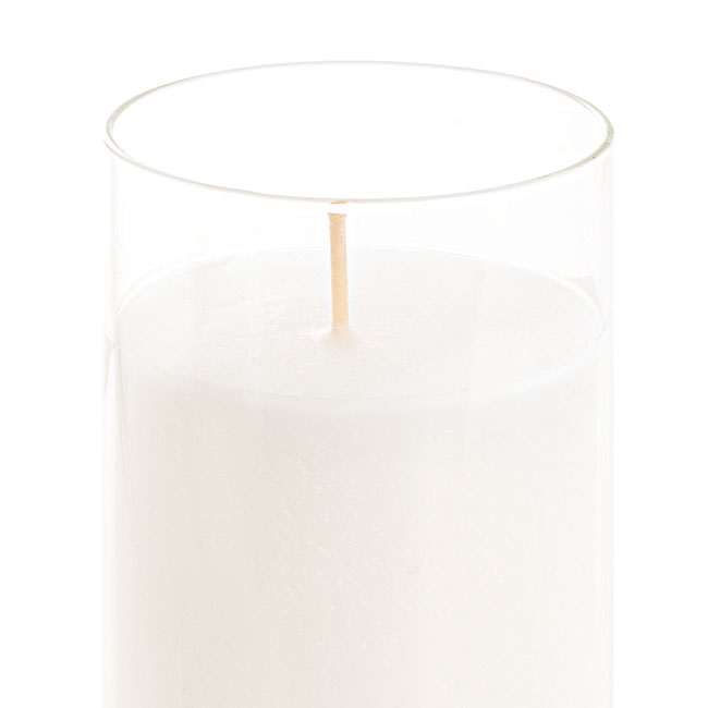 An elegant solution to the timeless and ubiquitous 'white pillar candle in a hurricane vase', this product is ready-made for your convenience. Featuring a wax pillar candle poured directly into a hurricane vase, this product is available in a range of heights, for an elegant and impactful staggered cluster effect. Sold individually