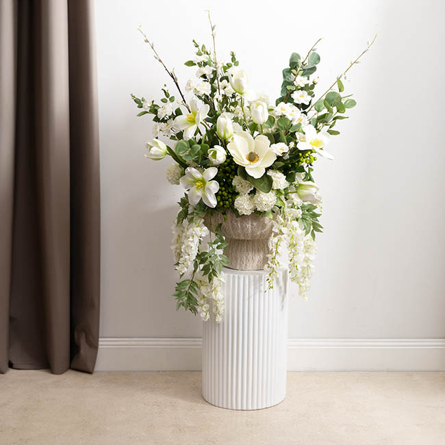This compote stands 25cm tall and has a base diameter of 19cm. It also features a top outer diameter of 39cm and an inner diameter of 34cm. The inner depth of this planter is 14cm. This item is sold individually.