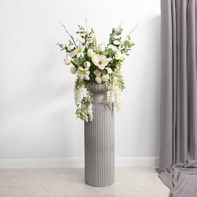 This textured round Fibreglass Compote Planter in Matte Limestone seamlessly blends durability and modern design. A large and stable piece, this planter provides ample space for your botanical displays, particularly as centrepieces at formal events. Suitable for use in indoor or outdoor spaces, this contemporary and robust fibreglass planter effortlessly combines form and function.