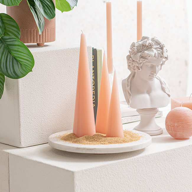 Our Fleur Cone Candle in Peach is a plain-coloured candle that will bring interesting shape and colour to your event and home decor. Pair with other candles from our Fleur range for a complementary cluster. This candle is dripless.