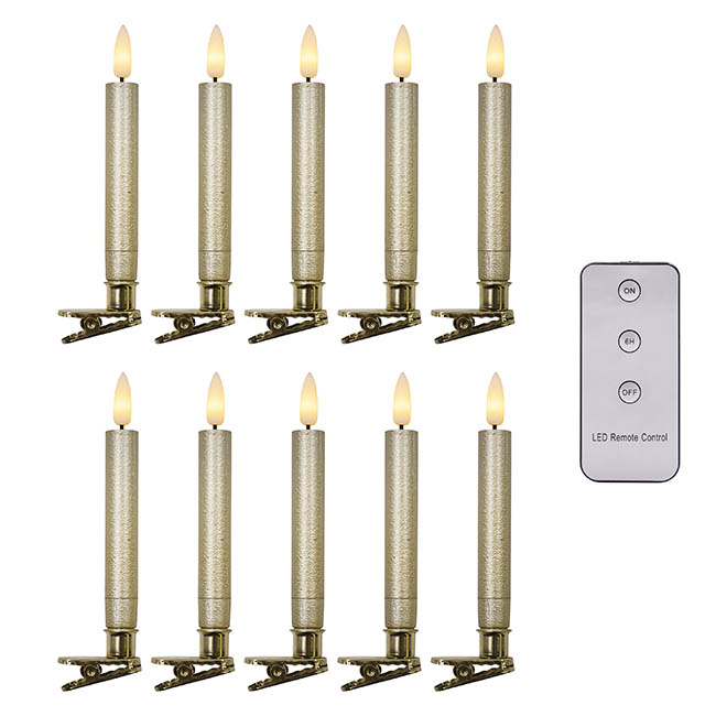 Each candle is powered by 1 x AAA battery, which is not included. Each candle measures 12.5cm tall and 1.5cm in diameter. The 3key remote functions with ON/OFF/TIMER, powered by 1 x CR2025 button cell, which is included. These LED candles are available in a pack of 10.