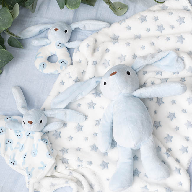 The bunny measures 32cm, with a sitting height of 23cm. The blanket measures 90cm x 75cm. This set is sold individually.