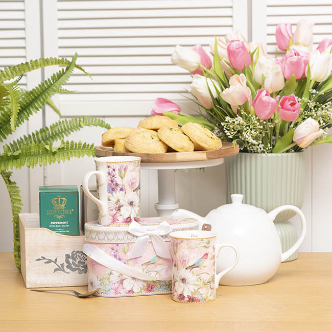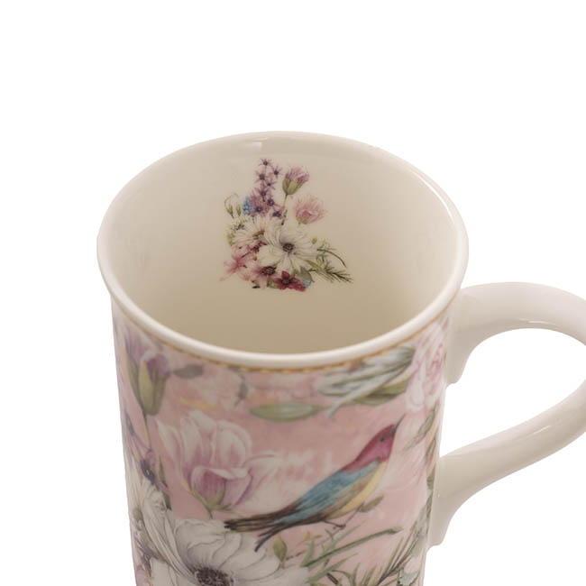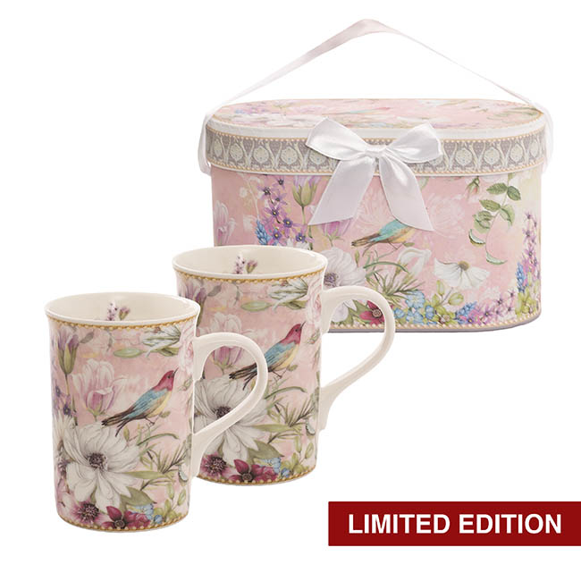 Delight someone special with this charming set of two mugs, featuring a delicate soft pink floral and bird design that radiates elegance. With a 7.5cm diameter, 10.5cm height, and 11cm length including the handle, these mugs are ideal for savoring tea or coffee. Beautifully presented in a matching gift box, they make the perfect gift for Mother's Day and other cherished occasions. Each mug holds around 320mL.