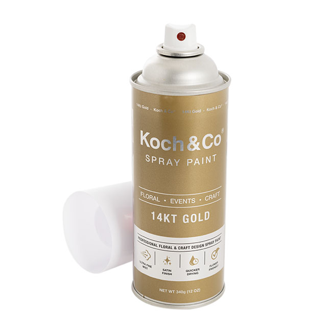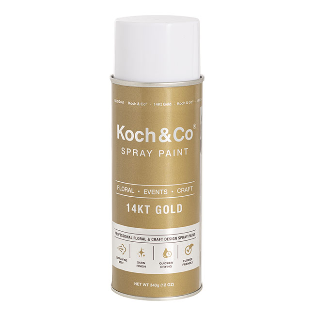 Koch & Co's Professional Floral and Craft Design Spray Paint in Metallic 14KT Gold harnesses the latest innovations in acrylic spray paint. This range has all the benefits of modern spray paints with a specialised gentle formula.