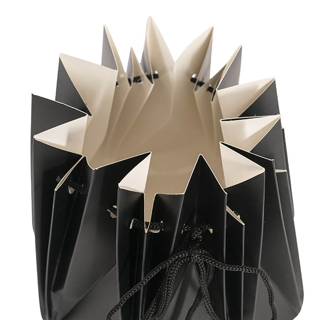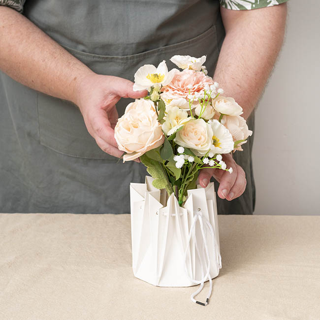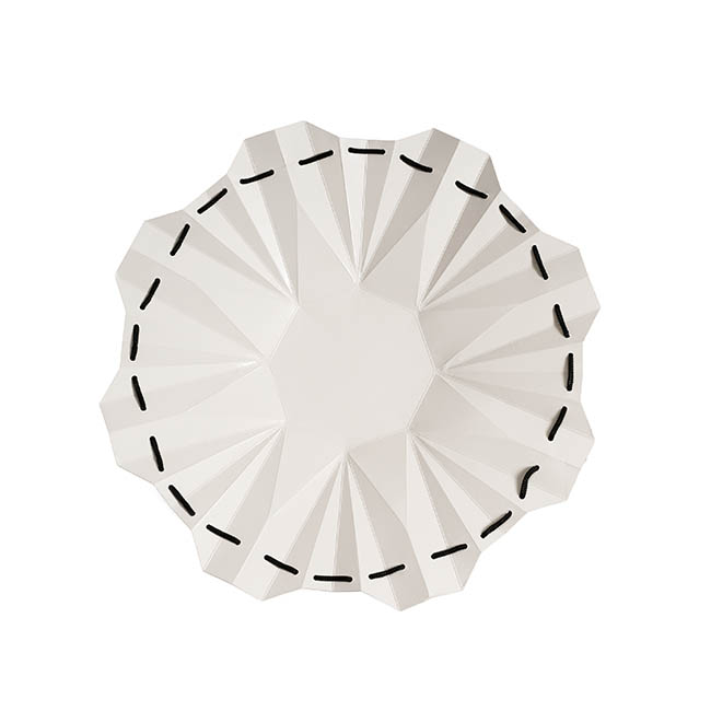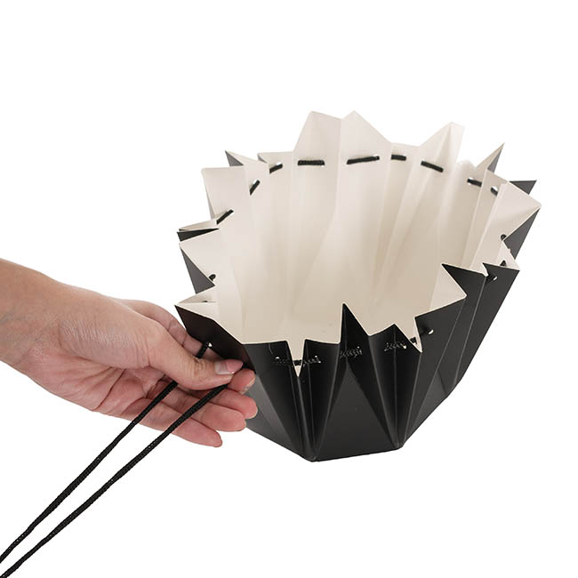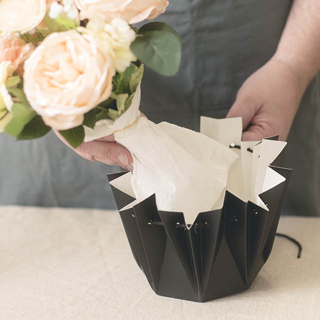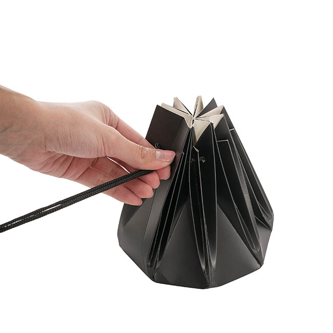 The pod is 13.8cm wide at the base and 14.4cm tall. They are flat-packed and pre-scored/pre-folded. The threaded rope helps you to pull the pod up and into place to surround your arrangement. Giving a lovely fluted designer look.