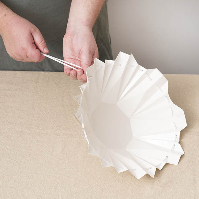 The pod is 16.5cm wide at the base and 17cm tall. They are flat-packed and pre-scored/pre-folded. The threaded rope helps you to pull the pod up and into place to surround your arrangement. Giving a lovely fluted designer look.