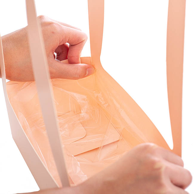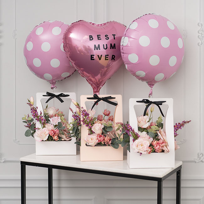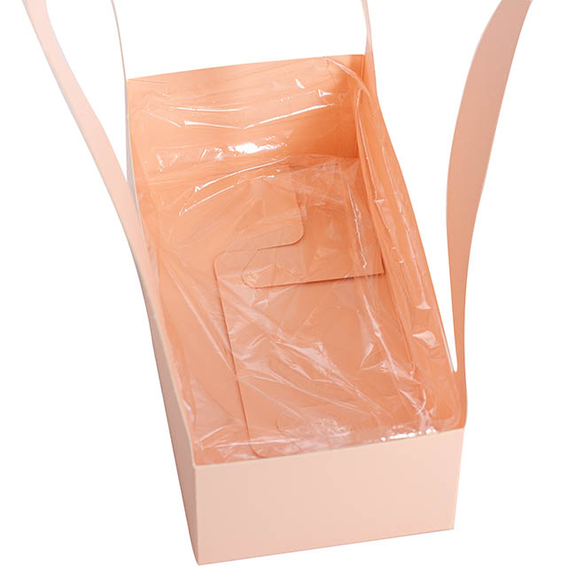 Our new flower carry box in pink, is a delightful way to present your floral arrangement when gifting. They come flat packed, easy to assemble. Has a plastic liner which you stick to the base to keep waterproof if using fresh flowers. It can fit a wet foam or dry foam brick, you just cut to size. Thread a ribbon (not included) through the holes on top and you have a gorgeous display of flowers. Made from 300gsm kraft paper solid colour 2 sides with PE coating inside making it water resistant. Measuring 35.5cm in height, 22cm wide and 11cm in depth. Available in a pack of 5.