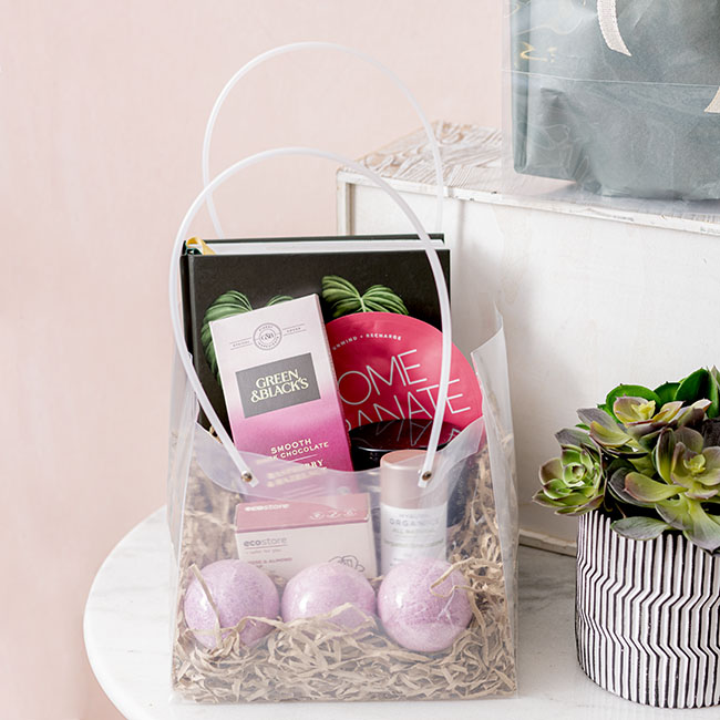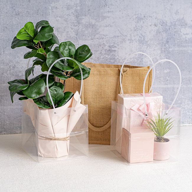 This square size clear plastic flower gift carry bag is a delightful way to present your floral arrangement. Can also be used for gifts and hampers. Easy to transport with its plastic handles. They come flat packed in a pack of 5, very easy to assemble. The base is 25cm in length, width 25cm and 22cm high. Will hold approx 2.5kg.