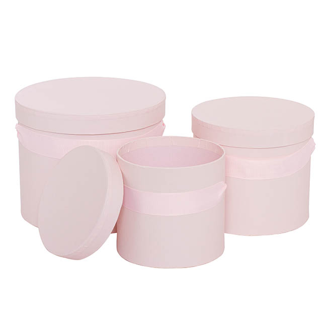 These light pink flower cylinder hat boxes can be used for all occasions. An alternative to wrapped flower bouquets, the flower boxes make a great presentation and can be transported securely. Includes a grosgrain ribbon handle matching the same colour as the box. Available as a set of 3.