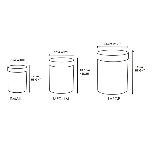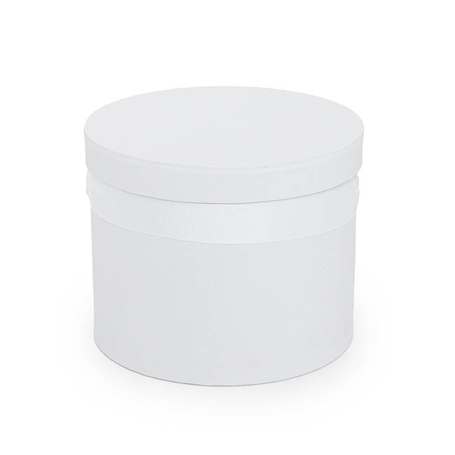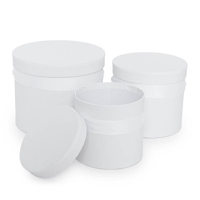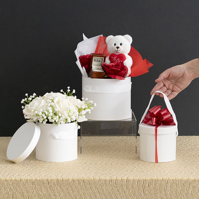 These white flower cylinder hat boxes can be used for all occasions. An alternative to wrapped flower bouquets, the flower boxes make a great presentation and can be transported securely. Includes a grosgrain ribbon handle matching the same colour as the box. Available as a set of 3.