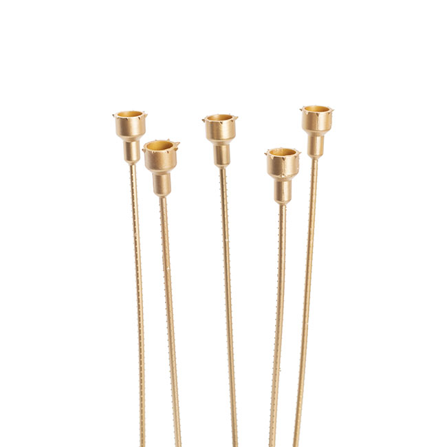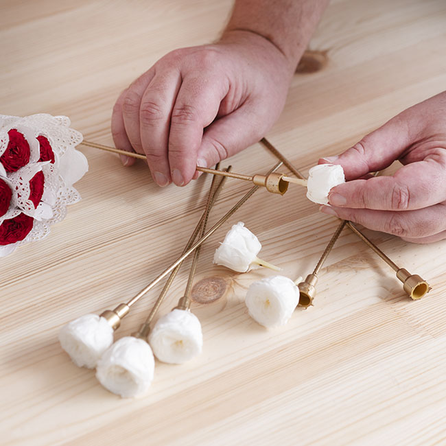 These gold plastic flower stems are ideal when working with preserved rose heads. Use them to display preserved roses of chocolates in your chosen container, whether it is an acrylic gift box, cardboard square box, or a round hat box.