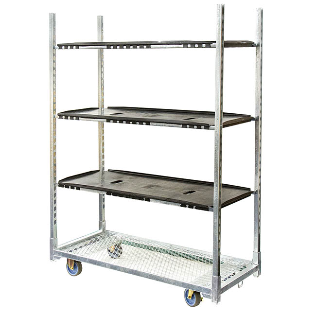 The trolley comes flat packed and is easy to assemble. It has four removable steel posts for shelves to be adjusted to required levels. Three waterproof shelves are included. The entire trolley measures at 135x56x190cmH.