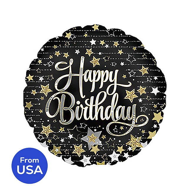 Excite that special person on their birthday with this "Happy Birthday" message 17" round foil balloon covered in black with silver and gold stars. The balloon is 42.5cm in diameter. Our balloons are high-quality helium balloons, they do not come inflated.