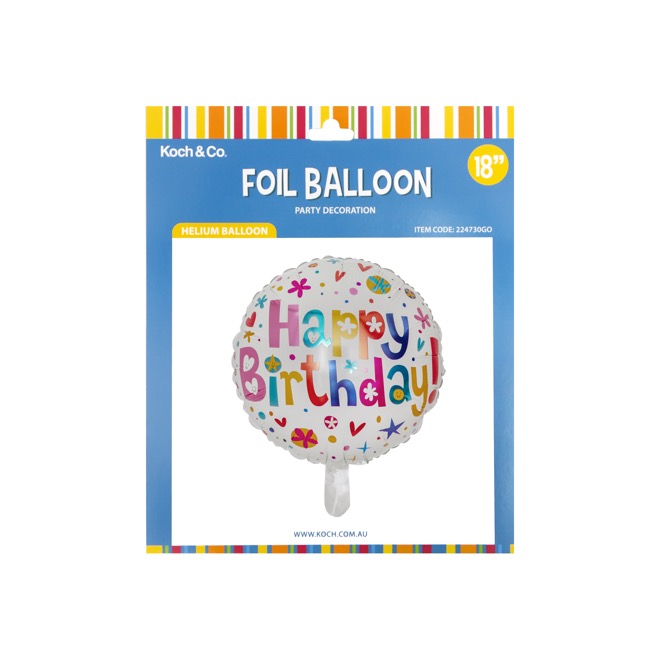 Designed by Koch this 18" (45cm) round shaped foil balloon has a Happy Birthday message. Sold in a pack of 5, this balloon is to be filled with Helium and is self sealed.