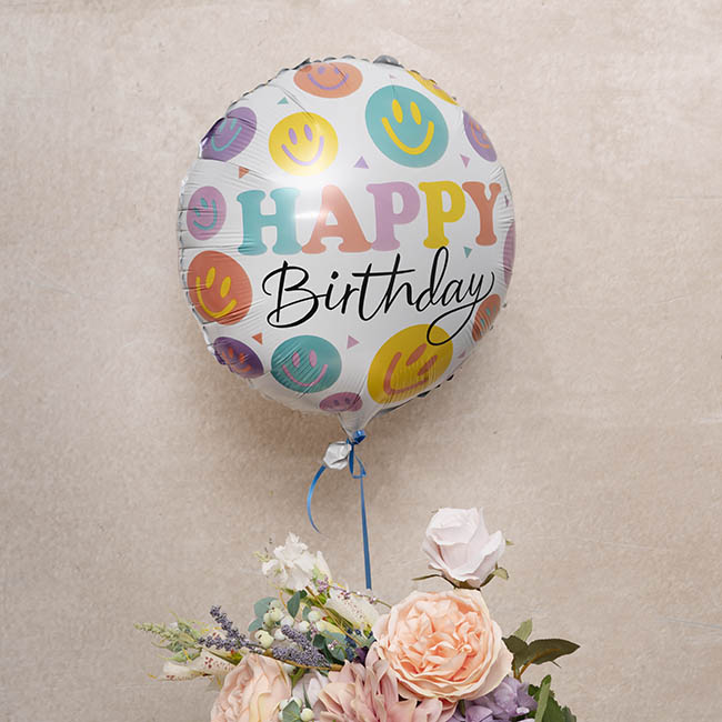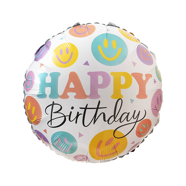 Celebrate in cheerful style with this 18-inch self-sealing foil balloon featuring a bright smiley face and a bold “Happy Birthday” message. Sold individually, it’s perfect for party décor, gift add-ons, or creating standout balloon arrangements.