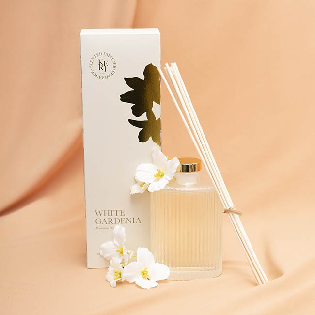 Packaged in a premium, plastic-free illustrative gift box, this diffuser fragrance is presented in a finely ribbed, tinted glass bottle.