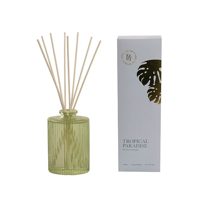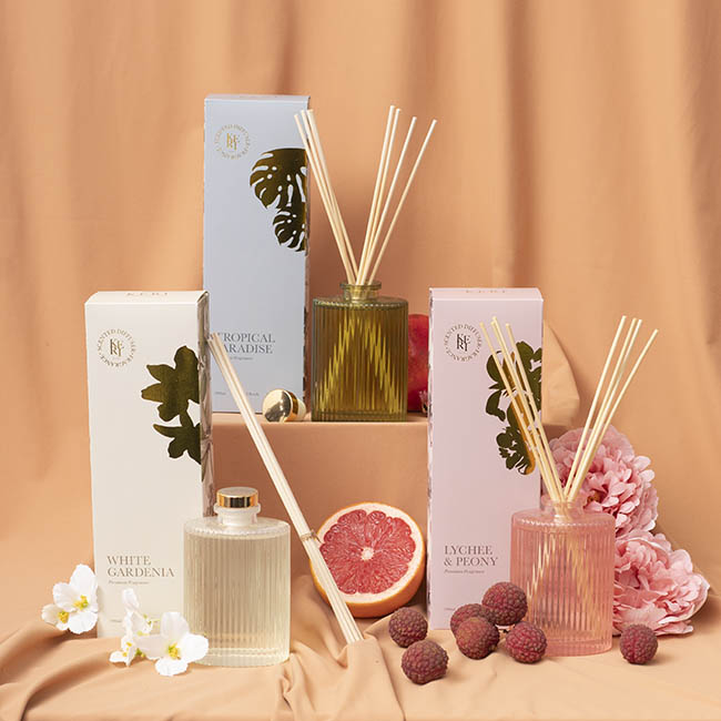 Packaged in a premium, plastic-free illustrative gift box, this diffuser fragrance is presented in a finely ribbed, tinted glass bottle.