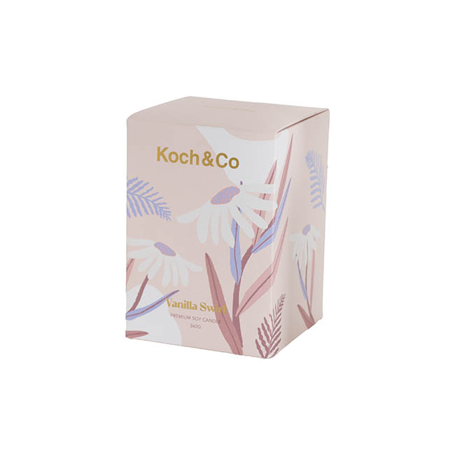 Perfect for home decor, floristry shops, or hamper gifting, this candle is beautifully packaged in a botanical-themed box that is completely recyclable and plastic-free. This candle has been poured into an opaque vessel that features gold detailing and a clear glass foot base. It also includes a snug-fitting and curvy transparent glass lid.