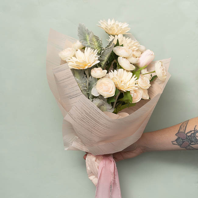 This flower wrap measures 50-micron in thickness and is waterproof. Each sheet size measures 50cm by 70cm. This wrap is available as a pack of 100 sheets.