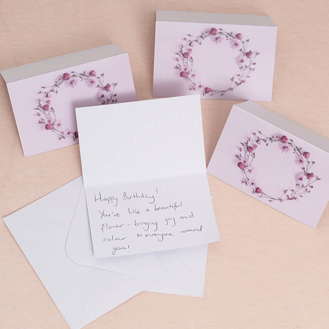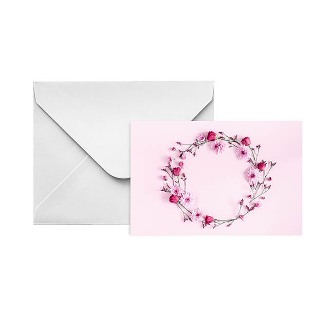 Make every floral arrangement, gift or hamper extra special with our beautifully crafted Folded Flower Crown Gift Cards and Envelopes. This top folding card features a close-up print of a dark pink flower crown. These cards offer a perfect finishing touch to any floral arrangement and present, offering a personal space on the inside for you to convey heartfelt messages or well wishes. The elegant fold-over design provides a premium feel and added privacy for your notes.