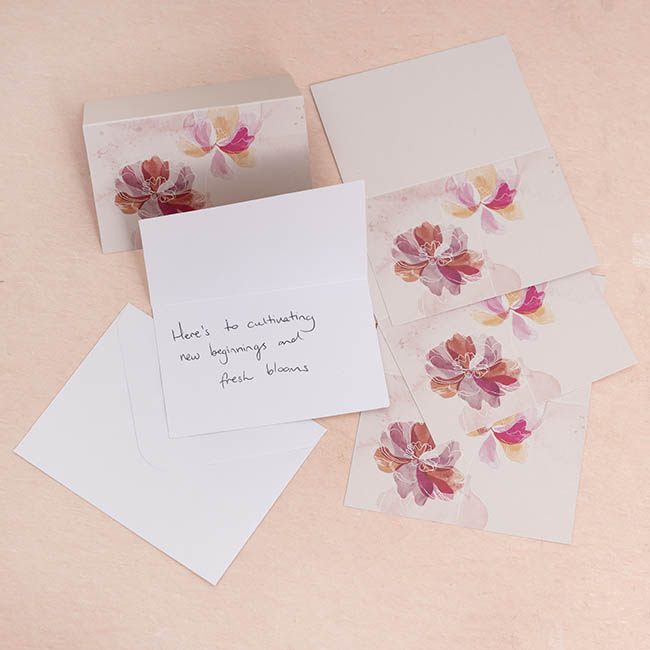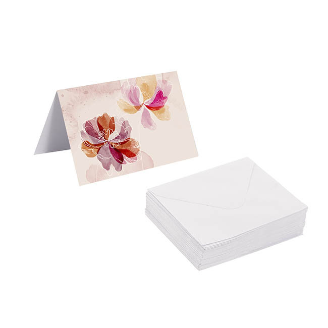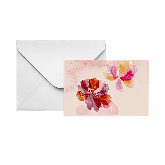 This top folding card features hand-drawn pink and orange flowers with white outlines. Use this card as the perfect finishing touch to any floral arrangement or present, offering a personal space on the inside for you to convey heartfelt messages or well wishes. The elegant fold-over design provides a premium feel and added privacy for your notes.