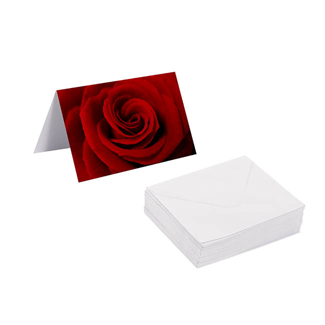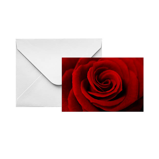 This top folding card has an amazing close up print of a traditional red rose print on the front creating a striking gift card.