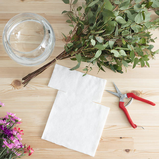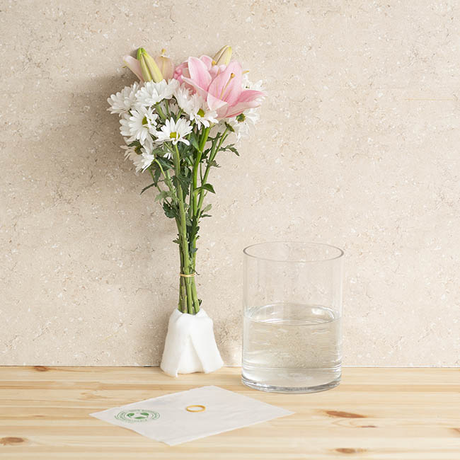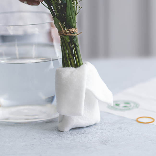 To use this product, wrap and fold to secure the fabric wrap around the end of your fresh flower stems. Then fully submerge your swaddled flower stems into a container of fresh water and wait 30 seconds or until the wrap is completely saturated. After you've let the excess water drain, the wrapped section is then inserted into the outer bag and secured at the top with a natural rubber band.