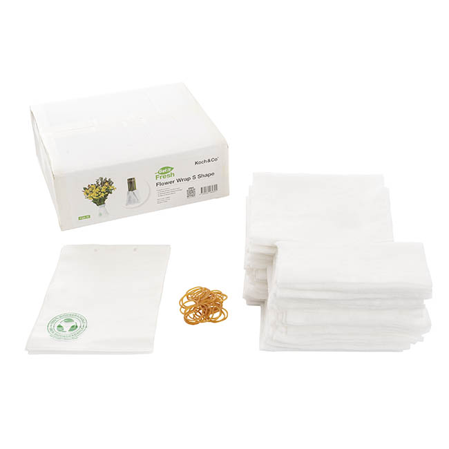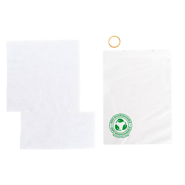 This handy S wrap allows bouquets to be transported or stored without the need for a bucket or vase. The wrap can be used on larger bouquets, can be cut into different shapes to fit your needs, and holds more water than the Get It Fresh Flower Bag. The wrap will keep your flowers hydrated for up to 5 to 7 days depending on weather and shipping conditions.