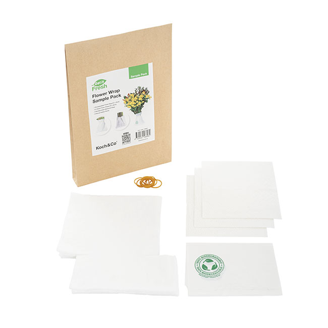 To use this product, wrap and fold to secure the fabric wrap around the end of your fresh flower stems. Then fully submerge your swaddled flower stems into a container of fresh water and wait 30 seconds or until the wrap is completely saturated. After you've let the excess water drain, the wrapped section is then inserted into the outer bag and secured at the top with a natural rubber band.