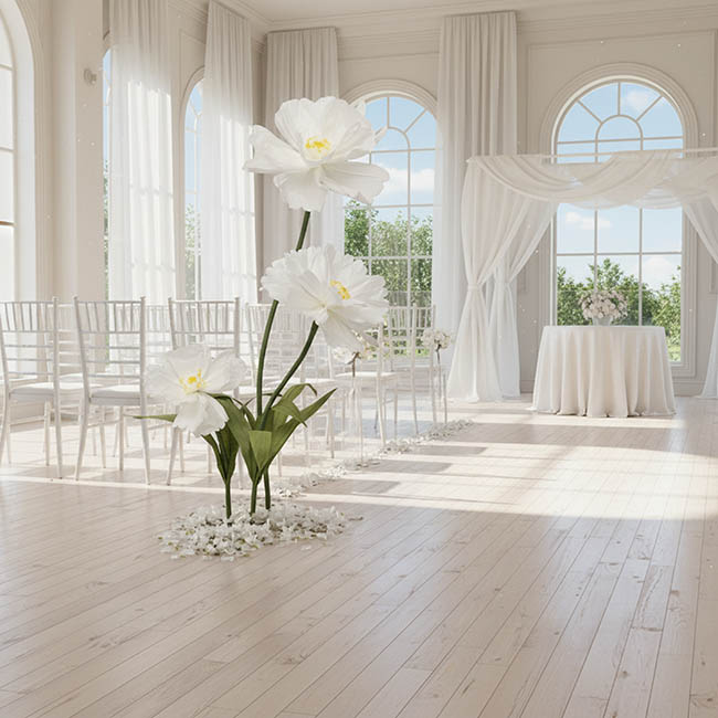 Each flower stands on its own stem secured to a 20cm base, with sizes ranging from a 20cm flower head at 60cm tall, a 30cm flower head at 95cm tall, and a striking 40cm flower head at 130cm tall. This set includes three differently-sizes flowers and the base.