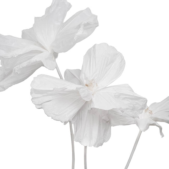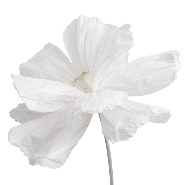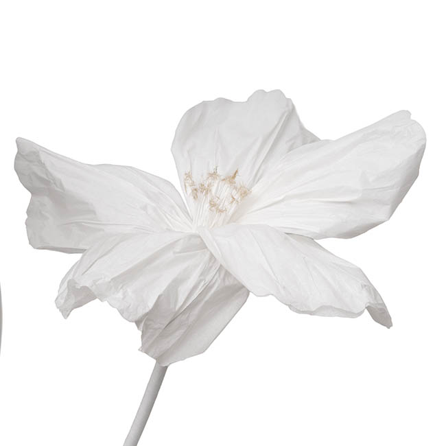 This stunning set of three white giant cosmos flowers makes an impressive statement in any event or interior display. Each stem is secured to a sturdy 30cm base, featuring a 40cm flower head at 95cm tall, a 50cm flower head at 120cm tall, and a grand 60cm flower head at 135cm tall. Crafted from delicate tissue-paper petals with underwire in both the petals and leaves, the flowers can be gently shaped to suit your styling needs. Please note, they are very fragile, not waterproof, and not recommended for outdoor use.