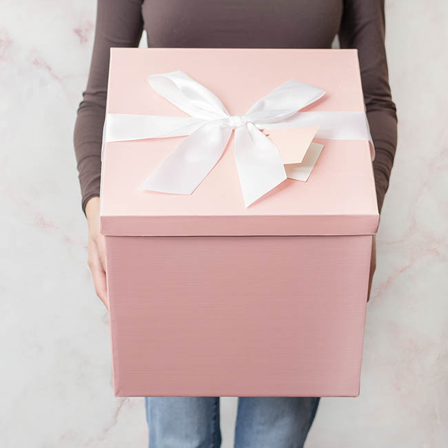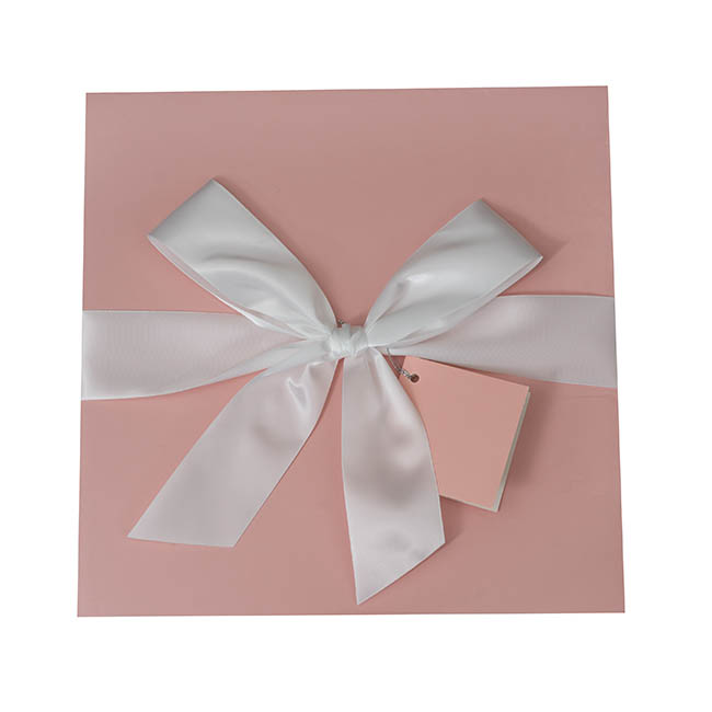 This box is flat packed for convenience and easy to assemble. Made of 300gsm E-flute corrugated materials, this box comes with a pre-attached white ribbon bow and small gift card.