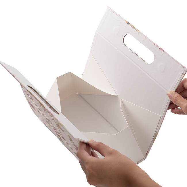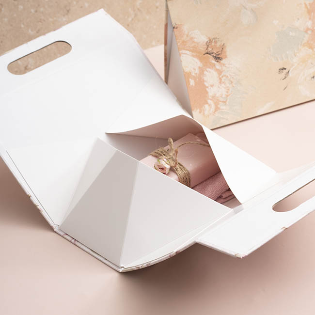 This box is flatpack and simple to put together. To assemble, simply push the sides up, add your gifts inside and push together to secure the magnetic closure. Add a ribbon through the handle to secure.