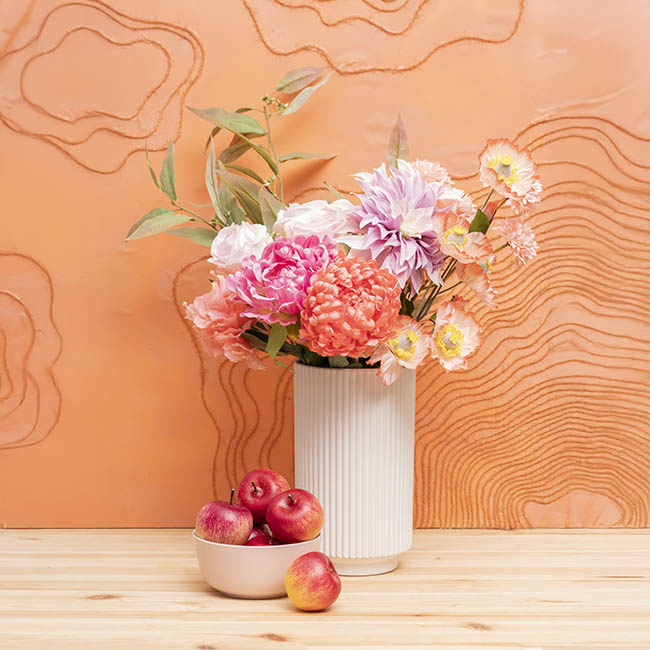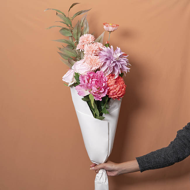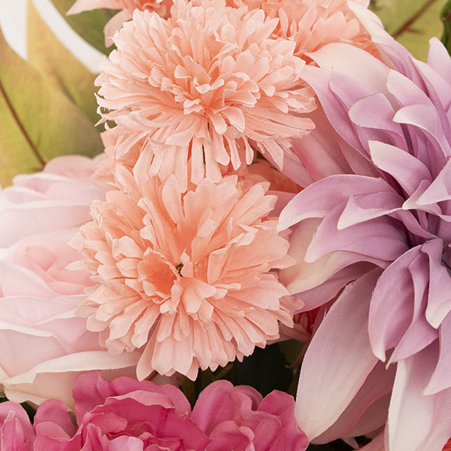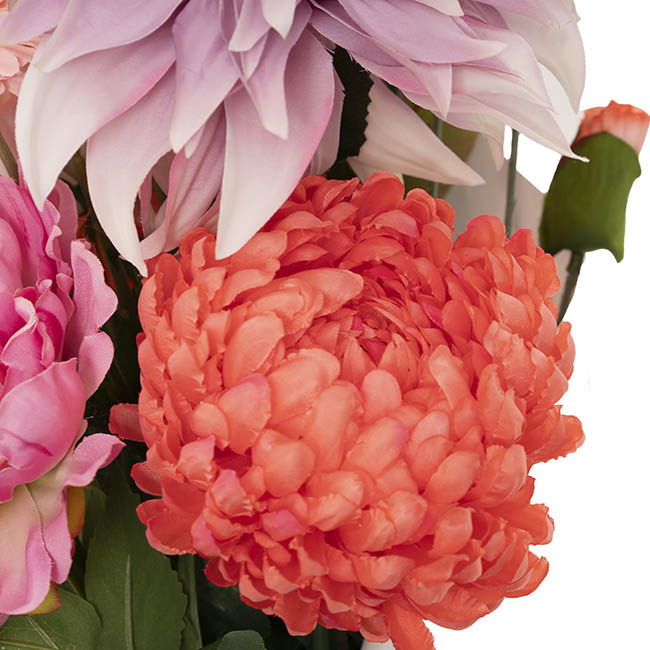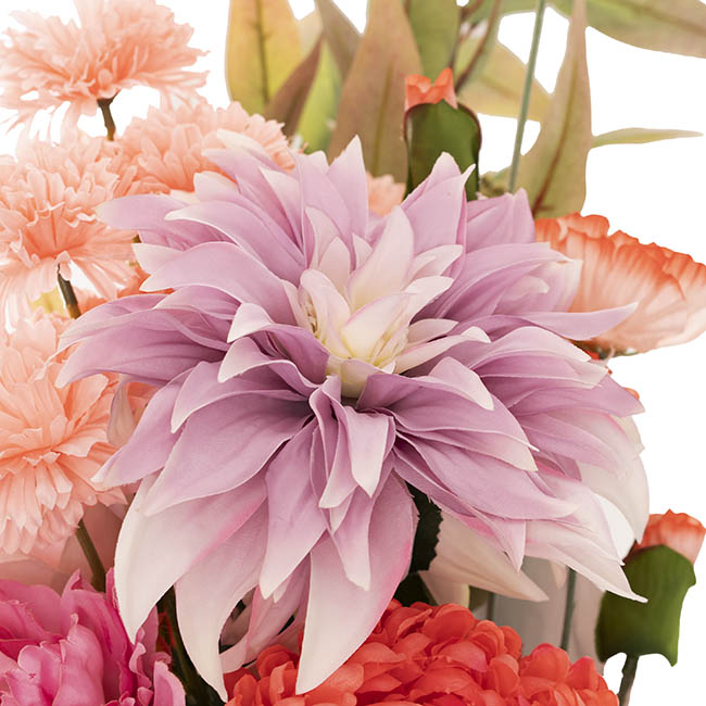 This stunning pre-made faux flower bouquet showcases a lush blend of pink and coral tones, perfect for effortless styling. Standing approximately 95cm tall, it features an abundant mix of roses, dahlias, chrysanthemums, peonies, poppies, eucalyptus willow leaves, and more for a full, elegant look. Designed to be placed straight into a vase with no arranging needed, the stems can also be trimmed to suit your desired height. Ideal for home décor, events, or gifting, it offers lasting beauty without maintenance.