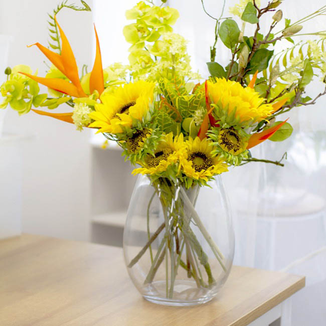 Display your floral arrangements in style with the beautiful range of Claire glass vases. The clear smooth glass allows the flowers to be the hero of the display while the trendy vase shape provides support for stems at varying angles. The Claire vase stands 26cm tall and is sturdy. Looks stunning on it's own or can be arranged with other vases from the collection for a unique display. Available in 3 sizes. The top opening measures at 14.3cmD.