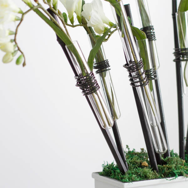 Short glass test tubes are used for single flower stems and buds. They can be wired into flower arrangements to accent special focal flowers. A popular trend for weddings and events. They are the same size as the Oasis glass test tubes and sold as a pack of 5. Pair with our coloured vases, such as our gold vases for an interesting contrast. The inner tube measures 16mmD.
