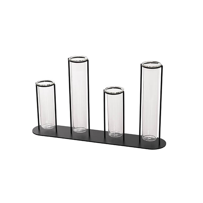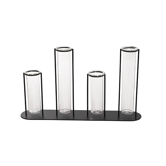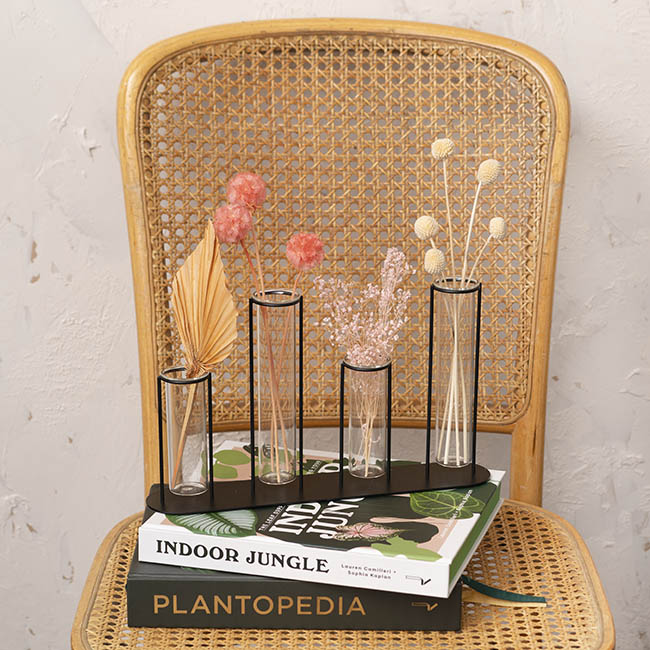 Crafted with precision, the sturdy metal frame provides a stable and elegant structure, while the clear glass tubes create a stunning visual contrast. The open design allows for easy access, making it simple to change water or swap out flowers as needed. Whether placed on a tabletop, shelf, windowsill, or as a low-lying centrepiece on a dinner table, this piece effortlessly blends into contemporary, industrial, or minimalistic interiors.