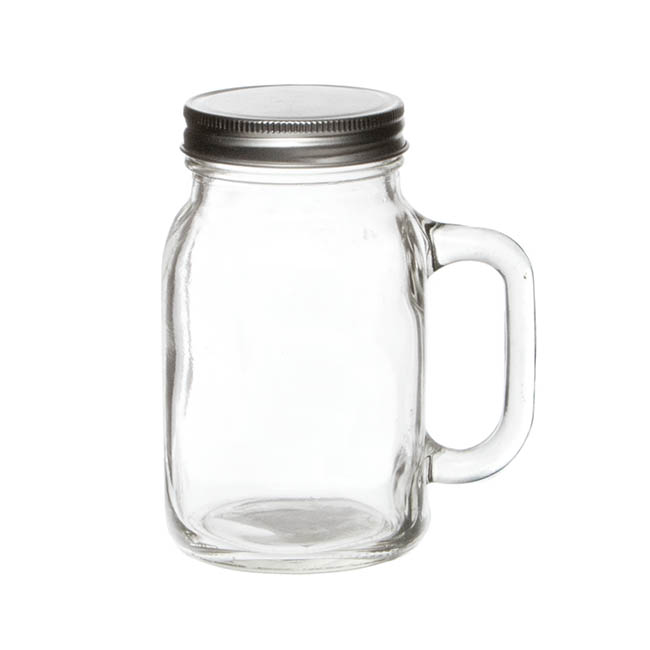 Clear mason jars with handle and a screw on lid. This clear vintage jar is sold for decorative purposes only. It is a very popular trend. You can style your DIY event with mason jars. Fluid capacity is approximately 500ml.