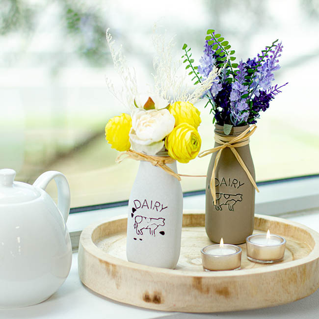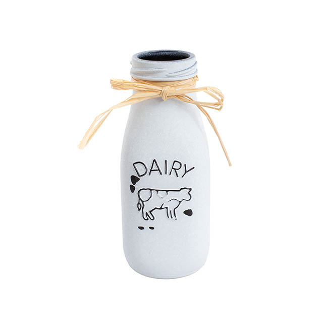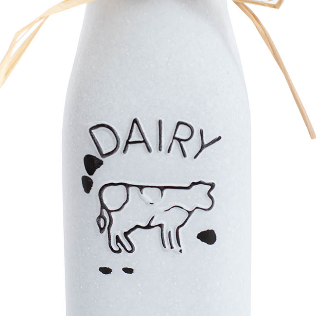 Reimagine the way your shop and home is styled by incorporating this rustic milk bottle that has a matte and chalky finish, featuring a 'DAIRY' and cow image. Includes raffia string and flower tag making the milk bottle ready-to-go with minimal accessorising. Pair with the other styles in this series for a complete look.