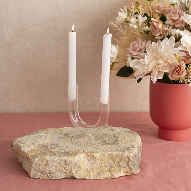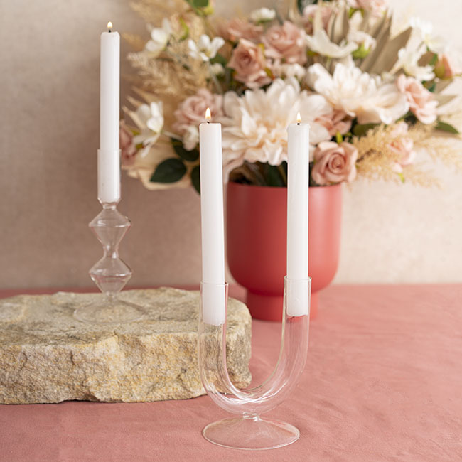 Suitable for use with our range of taper candles. Space between inner edges of candle holders measures 8.9cm wide. Space between outer edges of candle holders measures 10.9cm. Diameter of each candle holder measures 2.3cm. Measures 15.3cm high.